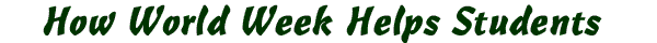 World Week encourages understanding and raises awareness of important global issues. It helps students grasp problems affecting the poor and gives them ways to respond. World Week engenders a global perspective while counteracting the very normal feelings of discouragement and helplessness, that come from hearing alarming statistics such as those associated with child deaths, HIV/AIDS prevalence, or environmental degradation.